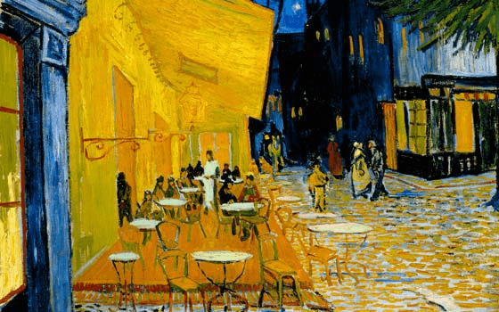 Em sua própria pintura, Van Gogh também baseou-se quase imperceptivelmente em motivos bíblicos. No centro de seu Terraço do Café à Noite (1888) há um garçom vestido de branco, de pé entre onze convidados sentados às mesas, enquanto uma décima segunda figura vestida de preto escapa por uma porta. Atrás do garçom há uma janela, dividida em quatro vidraças por uma cruz que o garçom quase parece carregar no ombro. Essa pintura tem sido chamada de A Última Ceia de Van Gogh, mas suspeito que ele estava tramando algo mais sutil: aqueles com olhos para entender discernem insinuações da monumental Última Ceia todas as noites em cafés perfeitamente comuns de Paris.